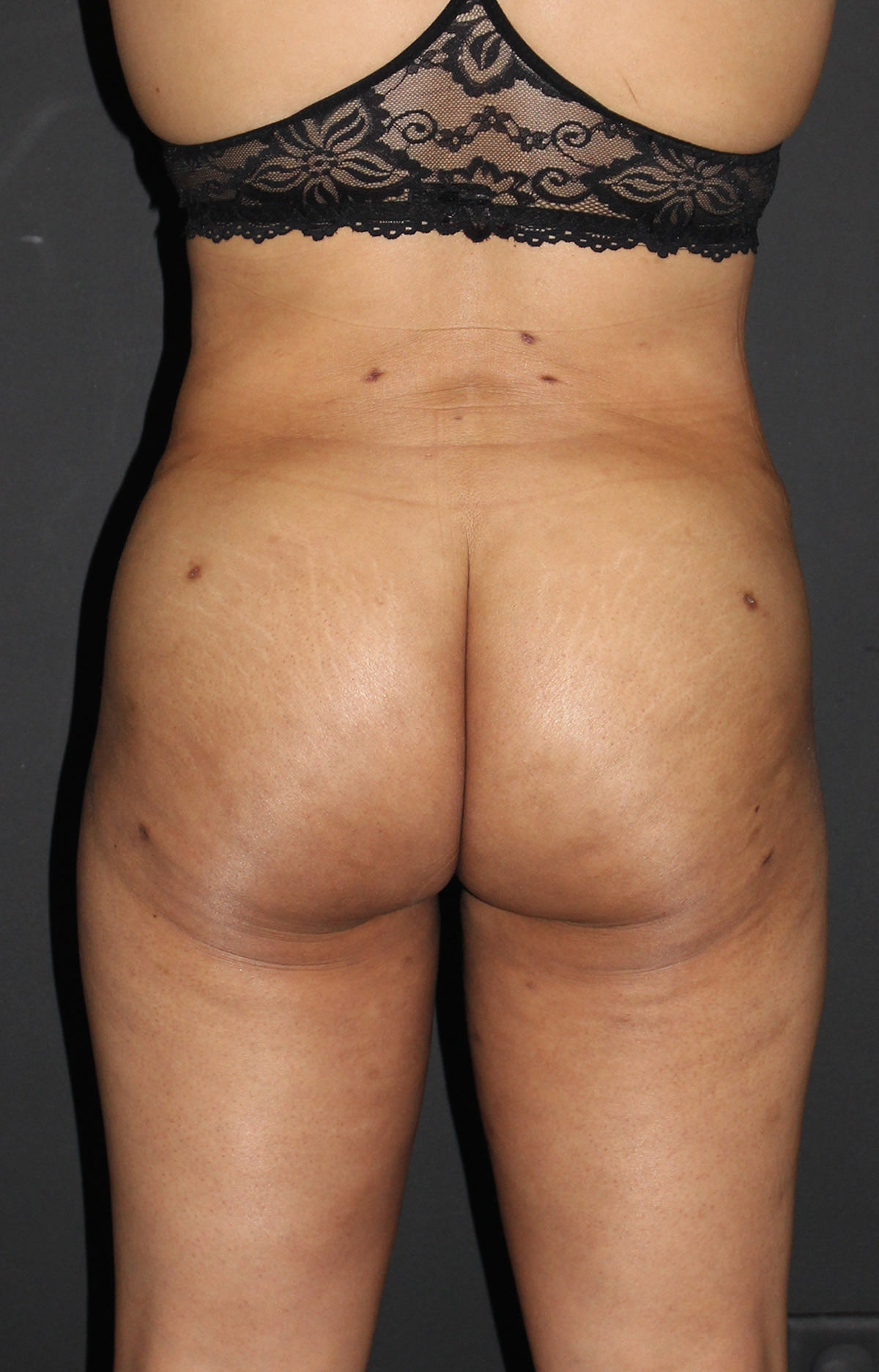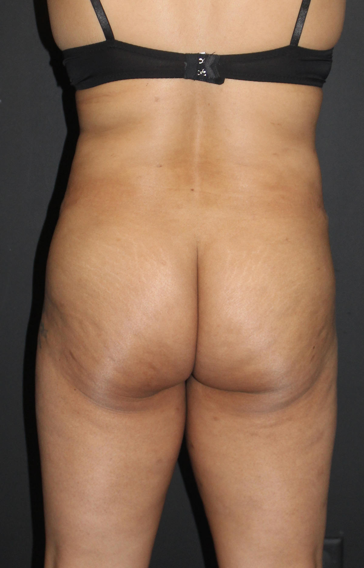 Patient had liposuction to her abdomen, flanks, and inner thighs and fat grafting to the buttocks.