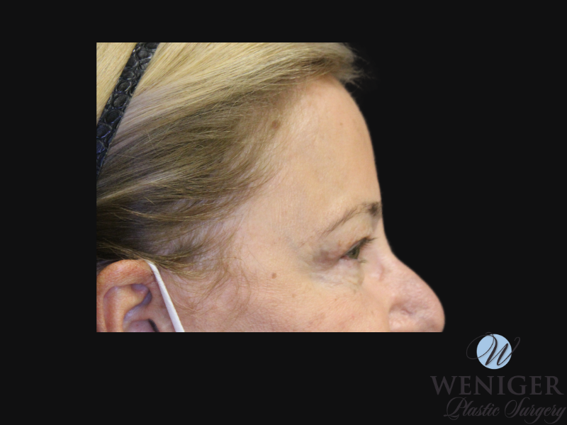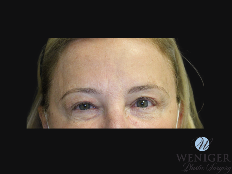 This 67 year old patient had concerns with the heavy hooding to her upper eye lids, Dr. Weniger performed an upper blepharoplasty to remove the excess skin on her eye lids.